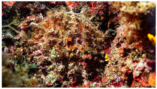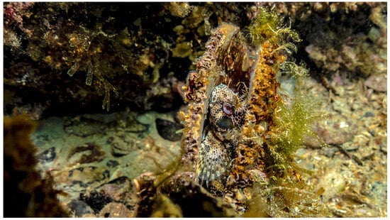 To our knowledge, the first documented reports of P. rudis in Apulia—and in the Province of Taranto in particular—are dated to summer 2023. Two specimens were reported on a social media forum from a locality 20 km away from Taranto [8], while we discovered a third at San Vito, a locality near the city of Taranto, thanks to notification from the Diving Center “Taras Sub” that was involved in our Citizen Science campaign. This specimen was very difficult to see, settled into a little hole among the coralligenous rocks, and the shell completely covered by organisms (Figure 10).