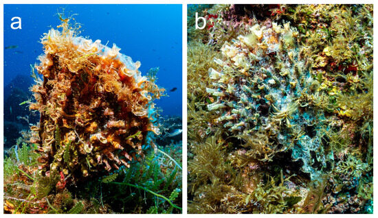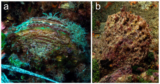 Furthermore, for a long time, we did not see any healthy individuals of P. nobilis either. Living specimens of both species were present there, together with a few empty shells, and all of them were found on rocky or coralligenous bottoms. After a more careful observation, the individuals initially recognized as P. nobilis, despite the fact that they exhibited the shells and size typical of the adults of such species, showed a different coloration of the mantle; it was not the typical pink [27] (Figure 8a), but iridescent with dark belts, more similar to that of P. rudis (Figure 8b). During the dives, we have observed other individuals exhibiting morphological traits, like shell ornamentations, their size, and the coloration of the mantle, that seemed to be a mixture of the two species (Figure 9). According to Vázquez-Luis et al. [28], it is possible that they could be hybrids. We did not perform mantle biopsies to confirm this hypothesis, and even though the putative hybrids exhibited morphological traits quite different from the hybrids showed in Vázquez-Luis et al. [28], these findings are very interesting and deserve more in-depth investigations.