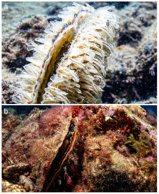 (a) A juvenile specimen in the Mar Grande of Taranto in 2016 with the typical coloration of the mantle (−4.5 m). (b) The posterior margin of a putative hybrid of Pinna nobilis x Pinna rudis. The peculiar coloration of the mantle is well visible. Pantelleria, Secca Campobello (−28 m).