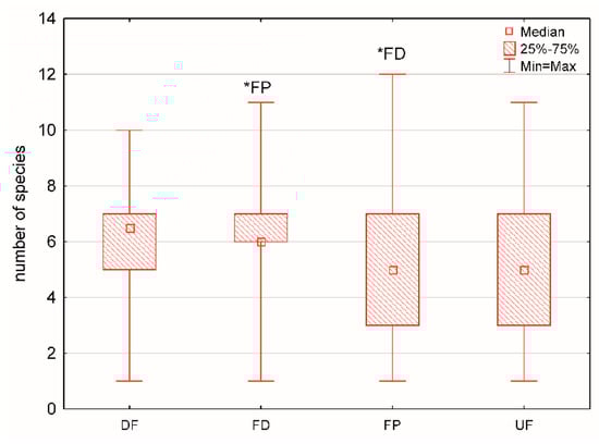 Box-and-whisker plot showing the number of mollusc species in the calcareous fen habitats (* significant differences between the habitats, the Kruskal–Wallis test and multiple comparison post hoc tests, H = 8.81, p = 0.0319). Abbreviations: UF—undrained fens, DF—drained fens, FD—fen ditches, FP—fen pools.