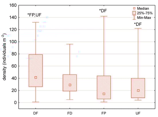 Box-and-whisker plot showing the density of Mollusca in the calcareous fen habitats (* significant differences between the habitats, the Kruskal–Wallis test and multiple comparison post hoc tests, H = 17.83, p = 0.0005). Abbreviations: UF—undrained fens, DF—drained fens, FD—fen ditches, FP—fen pools.