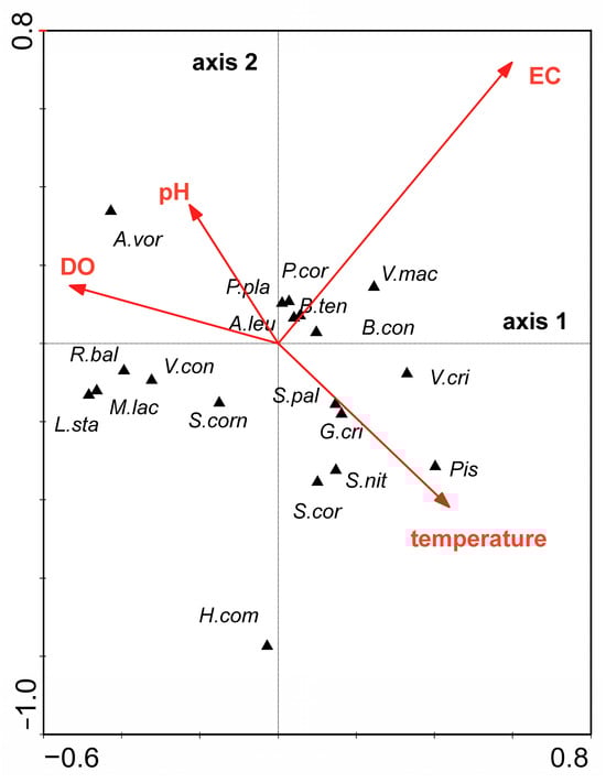 Ordination diagram (biplot) based on canonical correspondence analysis (CCA) of the Mollusca data and the physical and chemical parameters of the water (arrows represent statistically significant parameters of the water). Abbreviations: EC—electrical conductivity; DO—dissolved oxygen; temperature—temperature of the water. A.vor—Anisus vortex; A.leu—Anisus leucostoma; B.con—Bathyomphalus contortus; B.ten—Bithynia tentaculata; G.cri—Gyraulus crista; H.com—Hippeutis complanatus; L.sta—Lymnaea stagnalis; M.lac—Musculium lacustre; P.cor—Planorbarius corneus; P.pla—Planorbis planorbis; Pis—Pisidium sp.; S.nit—Segmentina nitida; R.bal—Radix balthica; S.corn—Sphaerium corneum; S.cor—Stagnicola corvus; S.pal—Stagnicola palustris; V.cri—Valvata cristata; V.mac—Valvata macrostoma; V.con—Viviparus contectus.