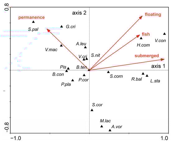 Ordination diagram (biplot) based on canonical correspondence analysis (CCA) of the Mollusca data and the selected environmental data (arrows represent statistically significant environmental characteristics). Abbreviations: permanence—habitat permanence; floating—floating macrophytes; submerged—submerged macrophytes; fish—fish predation pressure. Abbreviations for mollusc species see Figure 4.