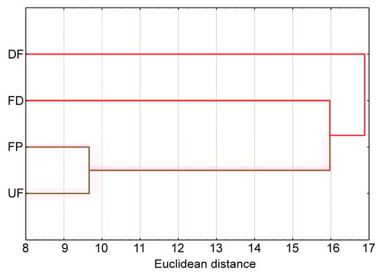 Dendrogram for a nearest neighbour cluster analysis based on Euclidean distances for the mollusc communities of the calcareous fen habitats. Abbreviations: UF—undrained fens, DF—drained fens, FD—fen ditches, FP—fen pools.