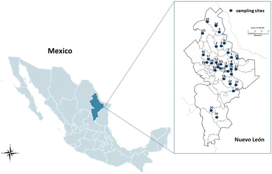 Geographic location of the 31 sites sampled in the northeastern Mexico semi-desert area.