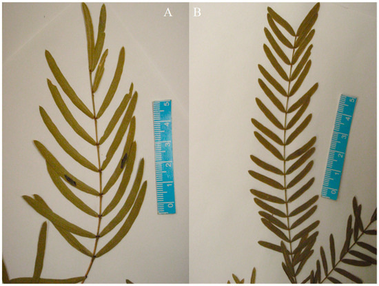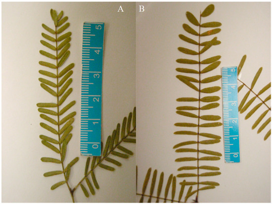 Morphological comparison of leaves between (A) Prosopis glandulosa var. glandulosa and (B) Prosopis glandulosa var. glandulosa x Prosopis laevigata.