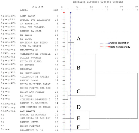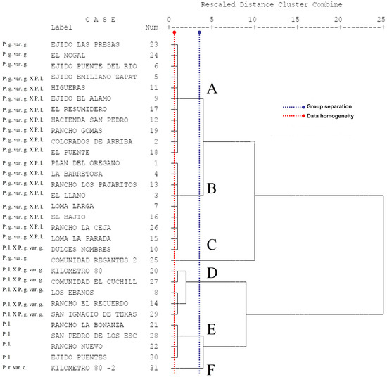 Figure 6 shows the homogeneity of the data, considering the red line of Euclidean distance <1, while the blue line of Euclidean distance <5 shows the formation of the following six groups: A, B, C, D, E and F.
