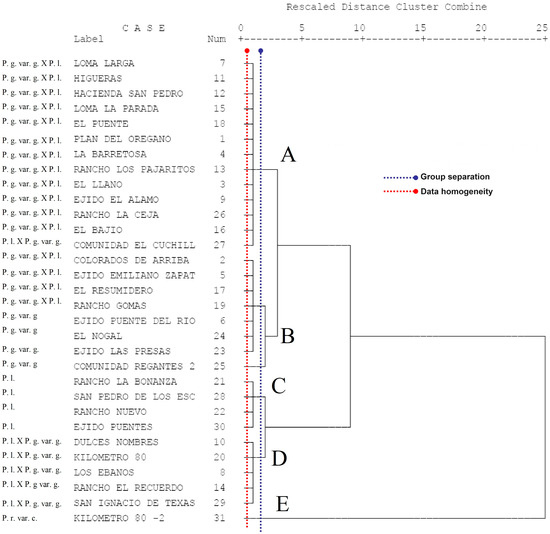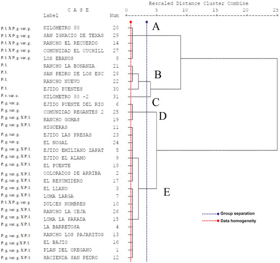 In Figure 8, the homogeneity of the data can be observed, according to the red line of Euclidean distance <1, while the blue line of Euclidean distance <5 shows the following five groups: A, B, C, D and E.