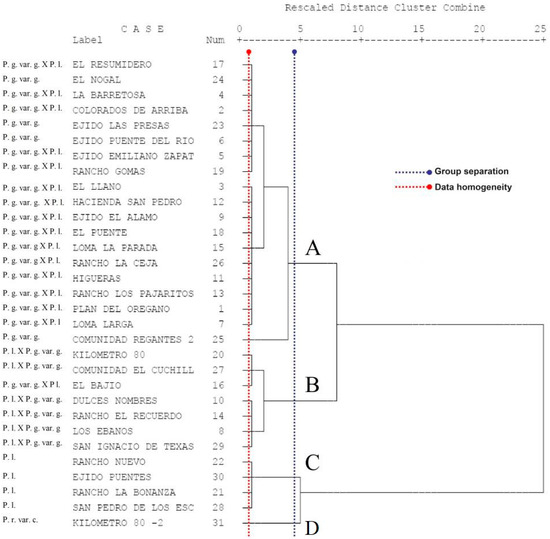 For the 31 localities, a database was obtained with the measurements of the 17 variables of the mesquite leaves, and the software of Statistical Package for Social Science (SPSS) version 15 for Windows was used to analyze the central tendency and dispersion, such as the average, standard deviation, values minimum and maximum and the coefficient of variation. A one-way analysis of variance and Tukey’s multiple comparison test of means [26] were performed to determine the difference and similarity between the localities, respectively, for the different parameters analyzed. A multivariate conglomerate analysis or cluster analysis was also used to integrate groups of sites that were associated with a taxonomic category assigned to mesquite and previously identified through traditional taxonomy. In relation to their groupings and their separation distances, dendrograms were generated that helped the formation of homogeneous and heterogeneous groups and the preliminary separation of the taxa, using a proximity matrix of Euclidean distances, where the number of clusters in each analysis was determined. The squared Euclidean distance between the groups (sites) was calculated using Formula (1), as follows: