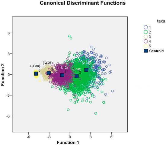 In Table 9, showing Wilks’ lambda for the contrast of the functions, it appears that taxa 1 to 4 have lambda values (0.196) closer to zero than one, and therefore, the groups are different; also, the chi-squared values (4899.423), plus the degrees of freedom (20), give a value of zero, so there is a highly significant difference (p = 0.000) between the groups or between the taxa. For the other contrasts of functions such as between taxa 2 to 4, taxa 3 to 4 and in taxon 4, the lambda values are close to one, indicating that they are equal to each other, but the chi-squared values plus the degrees of freedom give a significant difference between taxa or between groups.
