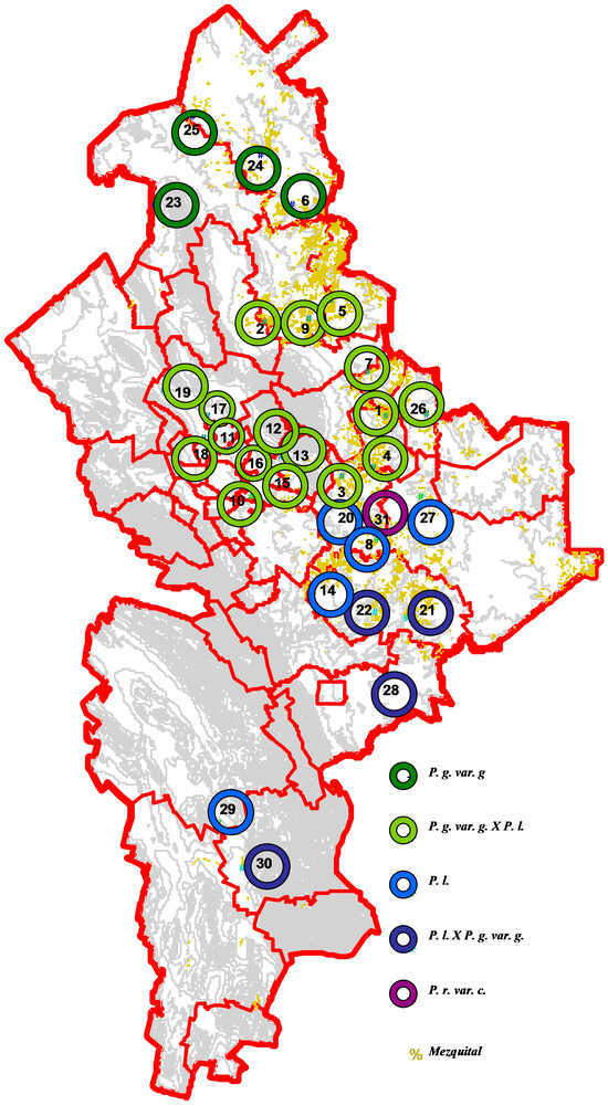 Based on the soil and vegetation use map with a scale of 2/50,000, 31 localities were selected, and simple random sampling was applied to collect leaves from Mezquite trees (Prosopis spp.). The design consisted of the random selection of 10 adult Mezquite trees that represent a “locality” or “site.” For each tree, 10 mature leaves were cut and collected in different vertical strata, to take measurements of the morphometric parameters. In addition, the ArcView version 3.2 program was used to geographically position the 31 sites (Figure 1 and Table 3).