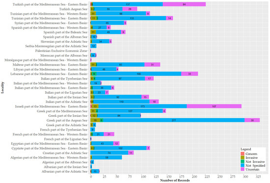 Regarding the location of all recorded species from WRiMS in the Mediterranean Sea, the most affected areas were identified. In the categories of species “of concern” and “invasive”, most are found in the eastern Mediterranean region, which is consistent with other relevant lists of NNS [8,43]. Most “invasive” species were found in the Greek part of the Aegean Sea and Israeli part of the Mediterranean—the eastern basin. In a period of 3 years (2017 to 2019), Israel, Turkey, and Egypt have the highest number of new NNS records [45]. In the eastern Mediterranean, especially in the Levant, the Suez Canal is the main vector of the invasion [73,74,75]. This study focused solely on the Mediterranean Sea, with the limitation that Black Sea records were not included in the analysis. The Black Sea is subject to numerous introductions, contributing to the spread of many invaders to the wider Mediterranean region. One notable example is the spread of Mnemiopsis leidyi from the Black Sea to the rest of the Mediterranean [76].