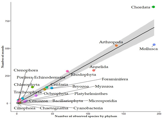 Number of records and number of species for all categories by phylum in WRiMS for Mediterranean Sea (R2 = 0.9222, p = 1.49 × 10−12 < 0.0001).