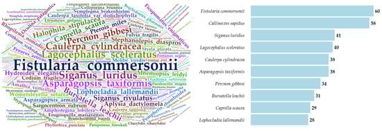 In addition, species abundance was calculated for all categories, disclosing that Callinectes sapidus and Fistularia commersonii are the most frequently recorded species (Figure 6).