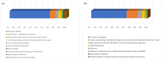 Similar to impacts, the vector of dispersal is not determined for most “invasive” species. It is often very difficult to link species to the introduction vector, additional data such as habitat and dispersal patterns are used [86]. Recent studies on NNS in the Mediterranean have shown that introductions via the Suez Canal and by shipping were almost equal between 2017 and 2019 and that a significant number are imported via the aquarium trade [45].