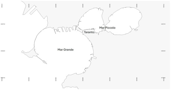 Taranto is known as the city of two seas. A map of the marine area with Mar Grande and Mar Piccolo. The numbers indicate UTM coordinates.