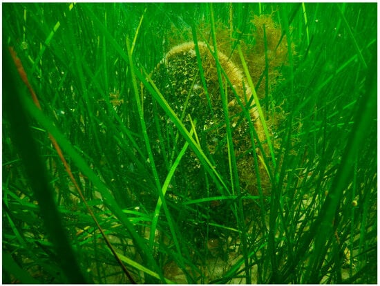For several years, starting from 2014, it was common to see specimens of the fan mussel Pinna nobilis (Linnaeus 1758) among the shoots of C. nodosa [19] (Figure 4). The big bivalve mollusk shows a marked preference for this phanerogam in transitional waters, mainly due to the close bonds produced among the rhizomes, the sediments, and the byssus filaments [20,21,22,23]. Also of paramount importance is the protective effect of leaves against hydrodynamics, which fosters the mollusk’s larvae settlements [23]. In Spain, in the transitional system of the Ebro River (NW Mediterranean), the highest density of P. nobilis specimens were measured in zones where the C. nodosa meadow reached a cover of 80–100% [21]. In the Venice Lagoon (Adriatic Sea, northern Italy), the fan mussel density was the highest at the highest cover of the phanerogam, and it was preferably located at the border of the meadow, where the filtering activity can be enhanced [23]. Unfortunately, Figure 4 represents a historical relic; starting in 2018, P. nobilis has undergone a mass mortality in the Taranto seas, due to an infection by the protozoic parasite, Haplosporidium pinnae [24]. This caused its disappearance from the basin, as observed all around the Mediterranean Sea [25].