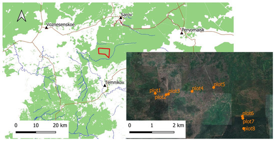 The research was conducted on the territory of the Mordovia State Nature Reserve (Central European Russia) (Figure 1). The total area of the Mordovia State Nature Reserve is 321.62 km2. The reserve is located on the southern border of the taiga zone and on the border with forest-steppe ecosystems. Most of the protected area is covered by forest ecosystems, some of which were affected by fires in July and August 2010. These fires in many areas have contributed to large debris of dry trees, deadwood, and the appearance of dead trees. Then new megafires were observed in August 2021. In the past, Pinus sylvestris L. was the main forest forming tree species in this area. Pine trees formed communities of pure or mixed forests. However, after the fires of 2010, many pine forests were damaged and replaced by thickets of Betula pendula Roth. Tilia cordata Mill. forms communities of pure forests in the northern part of the protected area. Oak forests occupy relatively small areas and are widespread in the floodplain of the Moksha River in the western part of the protected area. Soils are classified as predominantly sandy with varying degrees of podzolization in most of the territory. The average annual precipitation is 406.6–681.3 mm. The average annual air temperature is 4.7 °C. Maximum values are recorded in July and minimal values in February [35].