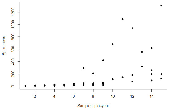 The carabid population in the control plot should be characterized (plot 8). Although the total number of species varies between years (28 and 37), the set of dominant species is stable. All of these species are typical of pine forests [37,47,48,49]. They belong to different groups of life forms. Carabus arcensis and C. glabratus are zoophagous walking epigeobionts, Pterostichus oblongopunctatus is a zoophagous soil-litter stratobiont, and Amara brunnea is a myxophytophagous geochorthobiont. The first two species are differentiated by size and life cycle (breeding and overwintering stages). Thus, a well-structured complex of carabids was formed in the control plot.