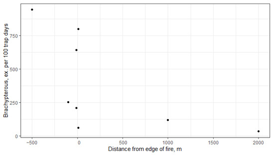 Brachypterous carabid abundance depends on distance from the edge of fire. Spearman’s rank correlation rho = −0.735, p-value = 0.0378.