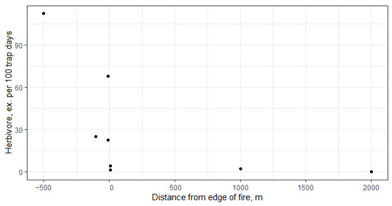 Herbivore carabid abundance depends on distance from the edge of fire. Spearman’s rank correlation rho = −0.916, p-value = 0.0014.