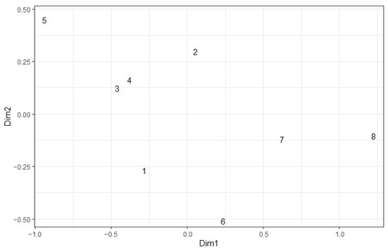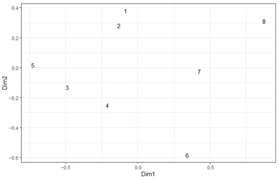 NMDS ordination plot of carabid complexes in 2023. Jaccard index for non-binary data. 1–8 are numbers of plots.