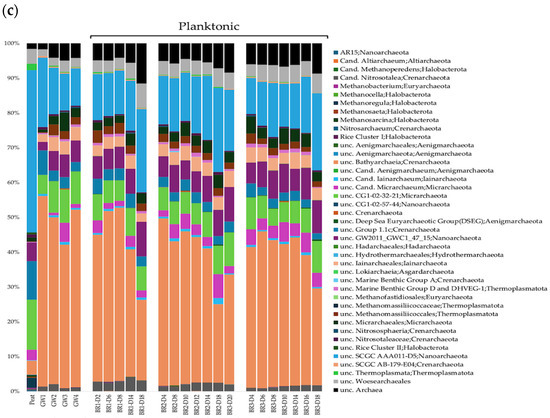 For the Archaea domain, due to the inability to sequence any of the DNA extracted from the rock chip surfaces, we only analyzed the planktonic community (Figure 5c). Unlike the two other domains, we did not observe major temporal patterns at the genus level in the planktonic community. Most of the dominant taxa identified in the initial groundwater sample were observed in the planktonic samples (unc. Bathyarchaeia, Nanoarchaeia SCGC_AAA011-D5, and Micrarchaeales CG1-02-32-21, as well as Nanoarchaeia GW2011_GWC1_47_15). We also detected the following genera: Crenarchaeota group 1.1c, candidatus (cand.) Micrarchaeum, unc. Methanomassiliicoccales, and cand. Nitrosotalea.