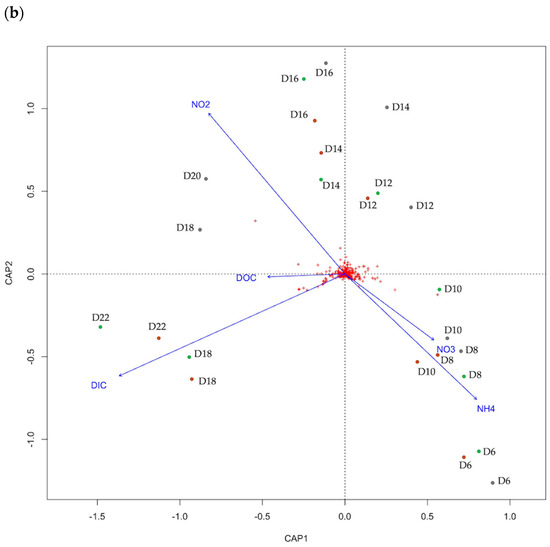 For the Archaea domain, the db-RDA also showed that both DIC and DOC were significantly correlated with the beta diversity of the planktonic community (Supplementary Material Table S11), and the graph indicated that both variables were correlated with later time point samples (18–20 days; DOC for bioreactor 2, and DIC for bioreactors 1 and 3) (Figure 9). Variance partitioning showed that DIC explained 9.34% of the community variance, and DOC explained 10.53% of it.