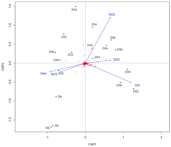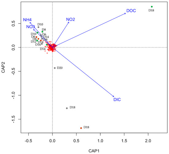 Visualization of the distance-based redundancy analysis (dbRDA) for the Archaea domain, using the geochemical parameters of the water in the bioreactors for the planktonic community. Samples from bioreactor 1 are in dark orange, those from bioreactor 2 are in green, and those from bioreactor 3 are in grey. Red crosses represent the ASVs. DIC, dissolved inorganic carbon; DOC, dissolved organic carbon.