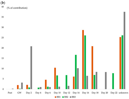 Microbial source tracking analyses were carried out for the Bacteria and Eukaryote domains. For the rock-attached sessile communities, we used the peat bog, the in situ groundwater, and the water samples from the previous time points as potential sources. For the bacterial sessile community, for which we only have the final time point, the water samples from days 14 and 16 were the biggest contributors (Figure 10a). The water samples from the 22nd day of the experiment (the latest water timepoint) did not contribute as much to the sessile community as the time points mentioned previously. The in situ groundwater contributed, on average, 2.29% for bioreactor 1, 0.68% for bioreactor 2, and 1.94% for bioreactor 3. For the eukaryotic sessile community, the water samples from days 14, 16, and 18 were the biggest contributors (Figure 10b). As observed for the Bacteria, the water samples from the 22nd day did not contribute as much to the sessile community as the time points mentioned previously. The in situ groundwater contributed, on average, 2% for bioreactor 1, 0.24% for bioreactor 2, and 3.18% for bioreactor 3.