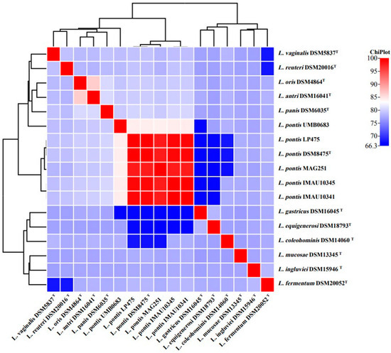 In this study, the ANI analysis was first performed on the whole-genome sequences of all strains in Table 1 and heat maps were drawn (Figure 1). The ANI values of these genomes were determined through pairwise comparison at the 95% threshold to further identify their species [22]. All strains clustered into two clusters: L. oris DSM4864T, Limosilactobacillus antri DSM16041T, Limosilactobacillus panis DSM6035T, L. reuteri DSM20016T, and L. vaginalis DSM5837T clustered in one large branch with L. pontis, indicating that they were more closely related to L. pontis; L. pontis IMAU10341, L. pontis IMAU10345, L. pontis LP475, and L. pontis MAG.251 clustered in one small branch with the type strain L. pontis DSM8475T (Figure 1). The ANI value of L. pontis DSM8475T was greater than 97%. In contrast, L. pontis UMB0683 was on the other small branch, and the ANI value with L. pontis DSM8475T was only 84% (less than 95%). In addition, the genomic characteristics of L. pontis UMB0683, downloaded from the NCBI, were also quite different from those of the other five strains. Thus, L. pontis UMB0683 is not a strain from this species and was excluded from further analyses. Then, the other five strains were analyzed, specifically L. pontis IMAU10341, L. pontis IMAU10345, L. pontis LP475, L. pontis DSM8475T, and L. pontis MAG.251.