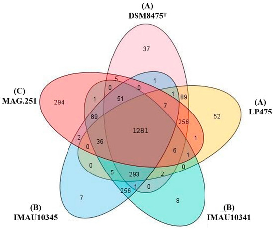 In order to compare the genetic differences between different strains, we used the Prokka (v1.1.1) and Roary (v3.13.0) software, with greater than 90% amino acid identity as the standard; the numbers of core genome and pangenome genes were counted [32]. The pangenome sets of the five strains of L. pontis contained 2166 genes, of which 1281 were core genome genes. There were eight and seven unique genes derived from fermented milk strains IMAU10341 and IMAU10345, respectively, which were all pseudogenes; 37 and 52 unique genes in sourdough-derived strains DSM8475T and LP475, respectively; and 294 specific genes in the animal-derived strain MAG.251 (Figure 2).