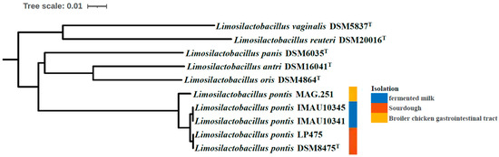 Comparative genomic studies of strains within the same species provide insights into genetic features, including gene modifications, gains, or losses, that facilitate the evolution and adaptation of strains to specific environmental niches [10]. In recent years, along with the development of rapid throughput DNA sequencing technologies, genome studies have become more feasible and affordable, and genomic data have become publicly available for numerous organisms [11]. However, the publicly available genomic data for L. pontis are very limited. Because pure cultures of L. pontis are not easy to obtain, there is little research on it. L. pontis is phylogenetically close to Limosilactobacillus vaginalis, Limosilactobacillus oris, and L. reuteri [1]. At present, compared with L. pontis, research on L. reuteri is favored in the field of Limosilactobacillus. L. reuteri can be isolated from the intestines of pigs, humans, and rodents. An investigation of L. reuteri from different sources has defined a phylogenetic tree based on core genomes that are distributed on different evolutionary branches, with habitats as clusters. This indicates that L. reuteri with different genetic backgrounds can selectively colonize and adapt to specific habitats, and this specific ability is significantly associated with the acid and bile salt tolerance and cell adhesion abilities of L. reuteri [12]. Most L. reuteri have good intestinal colonization and bacteriocin secretion abilities and have been widely used in daily life [13,14]. However, our understanding of L. pontis’ genomic characteristics is poor, which limits its application; comparative genomics could be used to reveal its genomic characteristics.