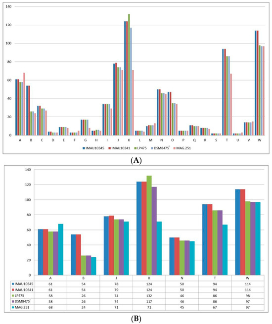 Annotation of L. pontis’s functional genes based on RAST database. (A) All RAST comment results and (B) some of the comment results. A: cofactors, vitamins, prosthetic groups, and pigments; B: cell wall and capsule; C: virulence, disease, and defense; D: potassium metabolism; E: miscellaneous; F: phages, prophages, transposable elements, and plasmids; G: membrane transport; H: iron acquisition and metabolism; I: RNA metabolism; J: nucleosides and nucleotides; K: protein metabolism; L: cell division and cell cycle; M: regulation and cell signaling; N: DNA metabolism; O: fatty acids, lipids, and isoprenoids; P: dormancy and sporulation; Q: respiration; R: stress response; S: metabolism of aromatic compounds; T: amino acids and derivatives; U: sulfur metabolism; V: phosphorus metabolism; W: carbohydrates.