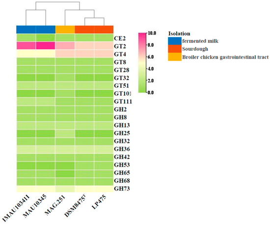 The CAZy annotation showing the distribution and abundance of CE, GH, and GT family genes in L. pontis was visualized as a heat map and clustered using the hierarchical clustering method. This showed that L. pontis was divided into three groups, representing the three different isolation sources. The predictions showed that the five strains contained 11 GH, eight GT, and one CE (Figure 5). There were differences in the composition of carbohydrate-active enzymes in the L. pontis strains isolated from different sources. L. pontis contained eight GT families, among which GT2 and GT4 were the most widely distributed, and GT2 was most abundant in strains from fermented milk. The GT32 family and GT101 family were only found in L. pontis MAG.251. L. pontis contained 11 GT families, of which GT36 and GT73 were the most widely distributed. GH53 was only found in sourdough strains. The functional genes varied in relation to the source and habitats, which may have resulted in evolution in different directions under the selection pressure of the living environment. GT2 and GT4 (glycosyltransferases, GTs), involved in the synthesis of cellulose and sucrose, were detected in L. pontis and were regarded as the largest family of carbohydrate enzymes, especially in strains isolated from fermented milk.