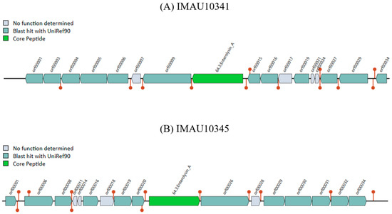 Bacteriocin gene clusters of IMAU10341 and IMAU10345. (A) IMAU10341 has one core peptide; (B) IMAU10345 has one core peptide.