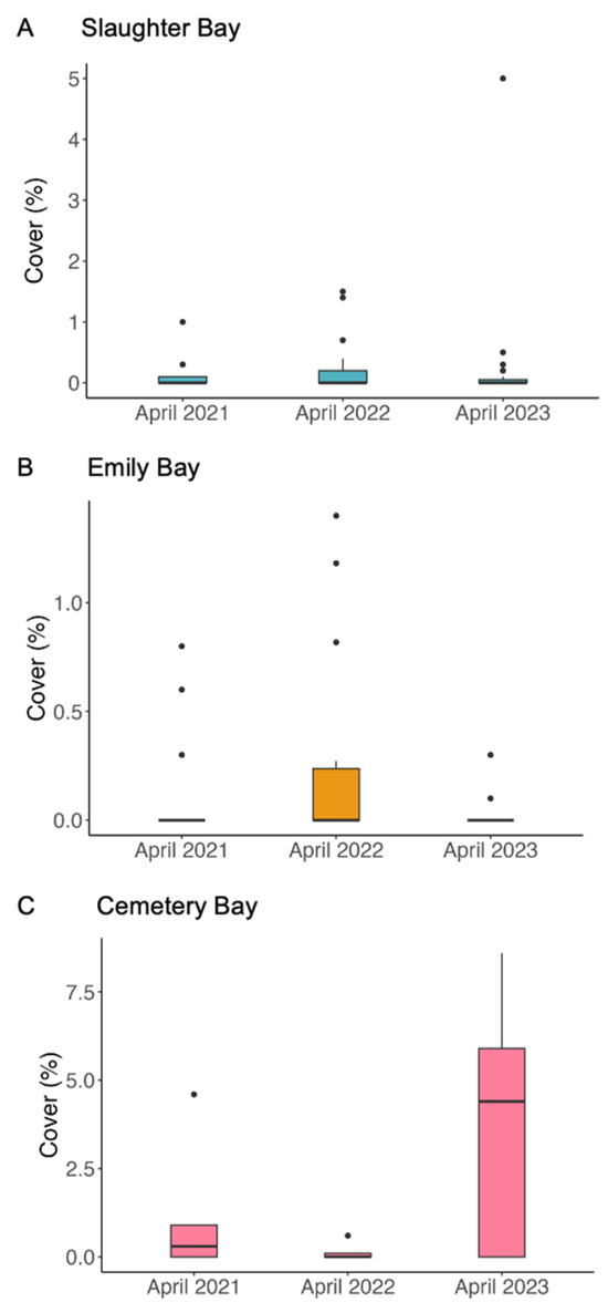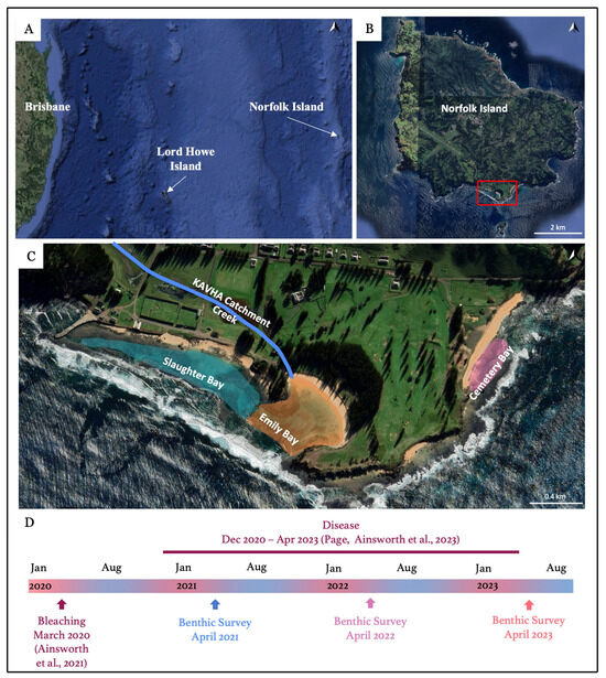 - Ainsworth, T.; Leggat, W.; Gaston, T.; Page, C.; Vuleta, S.; Sawyers, P.; Eckhardt, S. Reef Health Survey Report for Emily Bay and Slaughter Bay, Norfolk Island (January 2022–April 2023); Parks Australia: Canberra, Australia, 2023. [Google Scholar]