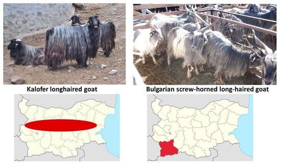 With respect to the local goat population, only two Bulgarian local goat breeds, namely the Bulgarian screw-horned long-haired goat (BSHL) and the Kalofer long-haired goat (KLH), exist [14,15,16]. The two local goat breeds are characterized by a distinctive phenotype and behavior, with the most prominent differences being in the color of the fur, the position of the horns, and the shape of the head [14].