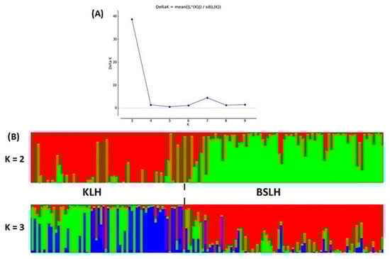 (A) Delta K plots of STRUCTURE analysis averaged over ten repetitions at K = 3. (B) Each color represents 1 cluster, with the length of each colored segment corresponding to the percentage of each individual belonging to a particular cluster. Black lines separate individuals belonging to each goat breed. Abbreviations: KLH—Kalofer long-haired goat breed; BSHL—Bulgarian screw-horned long-haired goat breed.