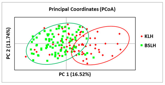 Principal Coordinate Analysis (PCoA) of the two goat breeds created by GenAlEx. A two-dimensional plot of the PCoA analysis shows the clustering of the 15 goat flocks (n = 6, KLH; n = 9, BSHL). The first and the second coordinates account for 16.53% and 11.74%, respectively, of the total variation. Abbreviations: KLH—Kalofer long-haired; BSHL—Bulgarian screw-horned long-haired.