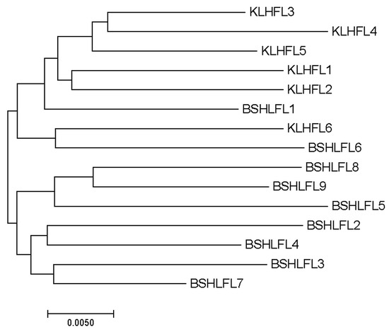 These observations were further supported when a visual representation of the phylogenetic relationships among all flocks was constructed by means of a neighbor-joining analysis tree (Figure 4). The phylogenetic tree clearly revealed some important points concerning the studied flocks from the KLH and BSHL goat breeds: (1) KLH flocks 1 and 2 were genetically differentiated from the remaining four flocks belonging to the same breed; (2) BVLH flock 1 was closer to KLH than to BVLH goat breeds, and (3) KLH flocks 6 and BSHL flock 6 were grouped closely together.