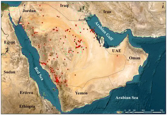 Previous records for the rodents of Saudi Arabia were extracted from published papers, reports, and the mammal’s collection of the late Prof. Iyad Nader, deposited at the National Center for Wildlife (NCW). Additionally, personal observations of rodents recovered from owl pellets and from trapping in different sites in Saudi Arabia by the NCW field biologists over the past three years (2022–2024), are included. Data on rodents’ distribution cover 176 localities (Figure 1, Appendix A). Records for each species reported previously are indicated with the reference number in parentheses. Scientific and common names were checked according to Burgin et al. [26].