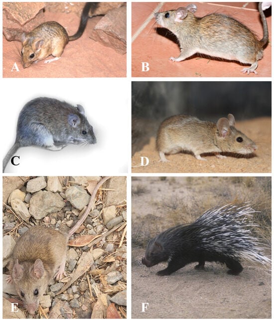 (A) Eliomys melanurus. (B) Scarturus euphratica (Photo by A. Shehab). (C) Jaculus loftusi. (D) Acomys dimidiatus. (E) Acomys russatus (Photo by B. Rubinic). (F) Gerbillus dasyurus (Photo by A. Shehab).