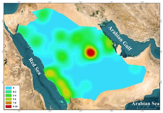 Previous report: Artawiya [6], Summan Plateau [9], Harrart Al Harrah [10,34], Saja/Umm Ar-Rimth [11,35], Turaif [12], Wadi As Sulai [13,22], Al Khubra, Mekka by pass, Makkah-Lith, Wadi Sirhan [14], Ara’r [24], Al Daba’ah, Bsitah [25], Hazm an-Nuquria, Ras al-Abkhara [36], Uruq Bani Ma’arid [37].