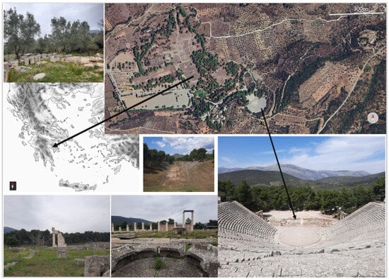 The Epidaurus archaeological area (Figure 1) was inscribed in the UNESCO World Heritage sites in 1988 (https://whc.unesco.org/en/list/491, assessed on 30 April 2024). It is located in a small valley in the Peloponnese (Prefecture of Argolis) and covers a core area of 1393.8 ha and a buffer zone of 3386.4 ha. The area belongs to the thermo-Mediterranean vegetation zone and is characterized by xerothermic climatic conditions. Concerning the geology of the area, ammonites, like petrified snakes, in pink Triassic limestones at the entrance to the sacred precinct of Asclepios in Epidaurus may have attracted attention to that site of ancient healing with its emblem—the snake-encoiled caduceus [35].