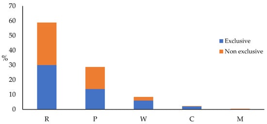 Habitat categories represented among all taxa. Abbreviations: R = agricultural and ruderal habitats; P = xeric Mediterranean phrygana and grasslands; W = woodlands and scrub; C = cliffs, rocks, walls, ravines and boulders; M = coastal habitats.