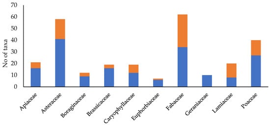 Richest taxa families and representation of ruderal (blue bars) and non-ruderal (orange bars) taxa among them.