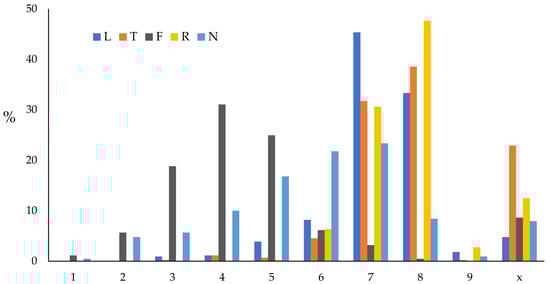 Ellenberg-type indicator values express plant ecological optima in the main environmental gradients [43,44]. The indicator values for light (L), temperature (T), moisture (F), soil reaction (R) and nutrients (N) follow [44,45]. For this study, indicator values for L are expressed on a scale from 1 to 9 (1: deep-shade plant; 9: full-light plant in fully irradiated places); for T (1: plants of cool sites, mean annual temperature < 8.5 °C; 9: plants of hot sites, mean annual temperature c. 20 °C and more); for F (1: strong drought indicator; 9: wetness indicator); R = soil reaction (1: indicator of strong acidity; 9: base and lime indicator); for N (1: indicator of nutrient-poorer sites; 9: indicator of very nutrient-rich sites); x = taxon species are indifferent concerning the parameter.