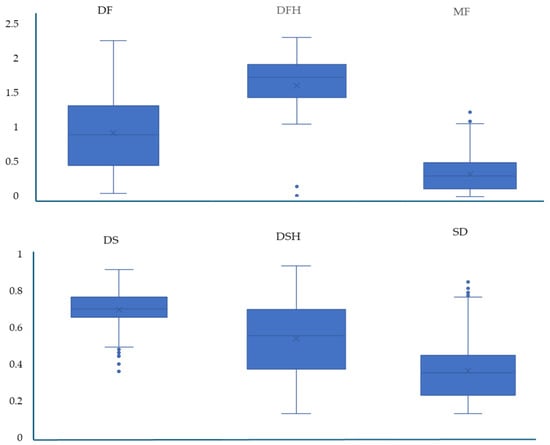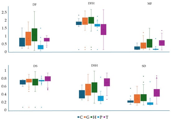 Figure 6 presents plant indicator values for DF, DFH, DS, DSH, MF and SD. Most of the plant taxa are indicators of low-to-medium DF and SD, high DS and also rather low indicators of MF. DFH shows higher values than DF for the majority of plants consisting of the herb layer, although DSH has low-to-medium values, lower than those for DS. Figure 7 presents plant indicator values for DF, DFH, DS, DSH, MF and SD for different life forms. Most of the therophytes are indicators of medium DFH and DSH, and low-to-medium MF and SD, while chamaephytes, geophytes and hemicryptophytes are high indicators of DFH, low-to-medium indicators of DSH and low indicators of MF and SD. Phanerophytes are indicators of high DS and of low DF, MF and SD.