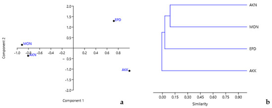 Diagrams of (a) the principal component and (b) hierarchical clustering analyses concerning the plant diversity of the archaeological areas of the Epidaurus (EPD) and three other archaeological areas of the Peloponnese, including the Akrokorinthos (AKK), Akronafplia (AKN) and Monemvasia (MON).